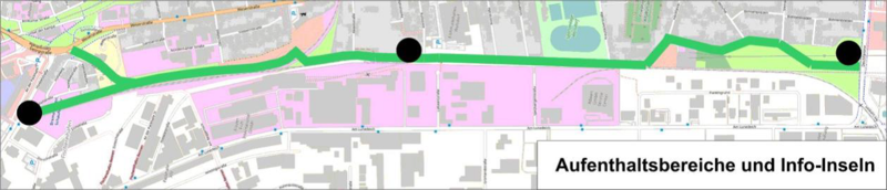 Da die Fahrradachse Fahr(G)Rad 8 auch geeignete Möglichkeiten zum kurzzeitigen Anhalten und Verweilen bieten soll, sind Aufenthaltsbereiche mit ergänzenden Info-Inseln vorgesehen.