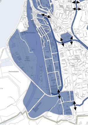 Nicht nur durch ihren Streckenverlauf zeichnet sich die Verbindung aus, sondern auch durch die Schaffung von Durchlässigkeiten im Wegenetz und der damit verbundenen Überwindung von Barrieren. Durch die Schaffung von Verbindungen, können Umwege und damit auch die Nutzung des Autos vermieden oder zumindest reduziert werden.Ost- West- Verbindungen, die quer zu dem im Grünen verlaufenden Weg geschaffen werden, ermöglichen zusätzlich eine Vernetzung der bisher voneinander getrennten Stadtquartiere. In diesem Sinne fördert Fahr(G)Rad 8 die Fortbewegung mit dem Rad und wird zu einer attraktiven Verbindung für den Alltags-, Freizeit- und touristischen Radverkehr. Mehr über die Maßnahmen zur Verbindung Vernetzung lesen Sie hier: Verbinden und Vernetzen. Die nebenstehende Graphik zeigt aktuelle linien- und flächenbezogene Barrieren in blauer Farbe.
